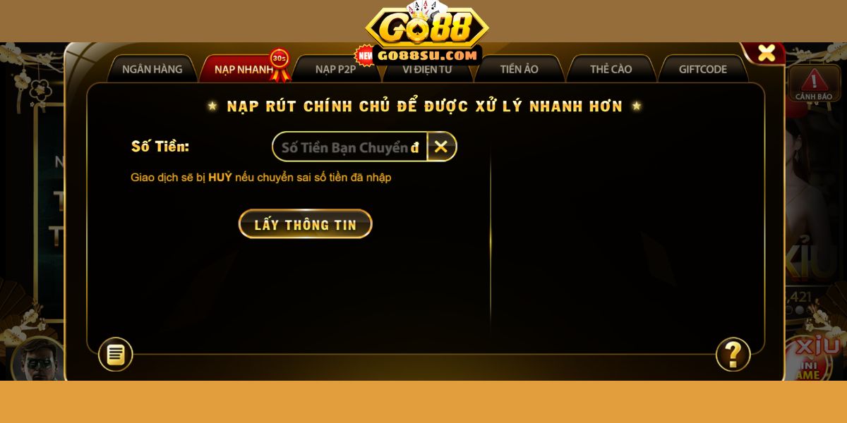 Trong kỷ nguyên giải trí trực tuyến, việc nạp tiền vào tài khoản để tham gia các trò chơi đổi thưởng yêu cầu sự chính xác, tốc độ và tính bảo mật cao. Hệ thống nạp tiền GO88 năm 2026 đã được nâng cấp mạnh mẽ với kiến trúc đa phương thức, giúp người chơi dễ dàng giao dịch chỉ trong vài phút. Để bắt đầu trải nghiệm tại nhà cái Go88, bạn chỉ cần thực hiện bước đăng nhập GO88 và chọn phương thức thanh toán phù hợp nhất với nhu cầu cá nhân.